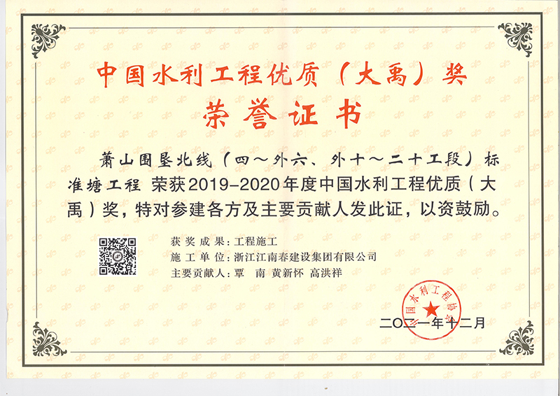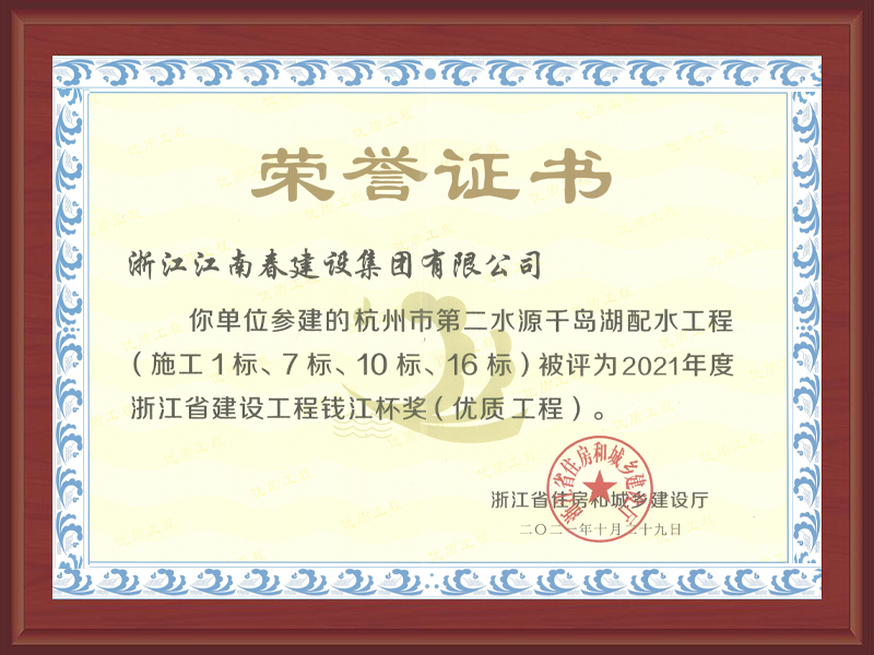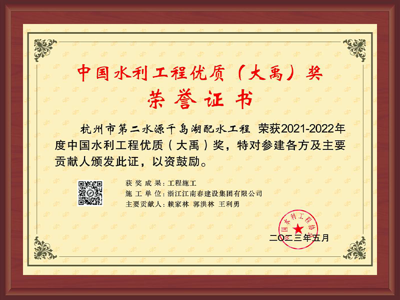 杭州市第二水源千島湖配水工程中國水利工程優(yōu)質(zhì)(大禹)獎