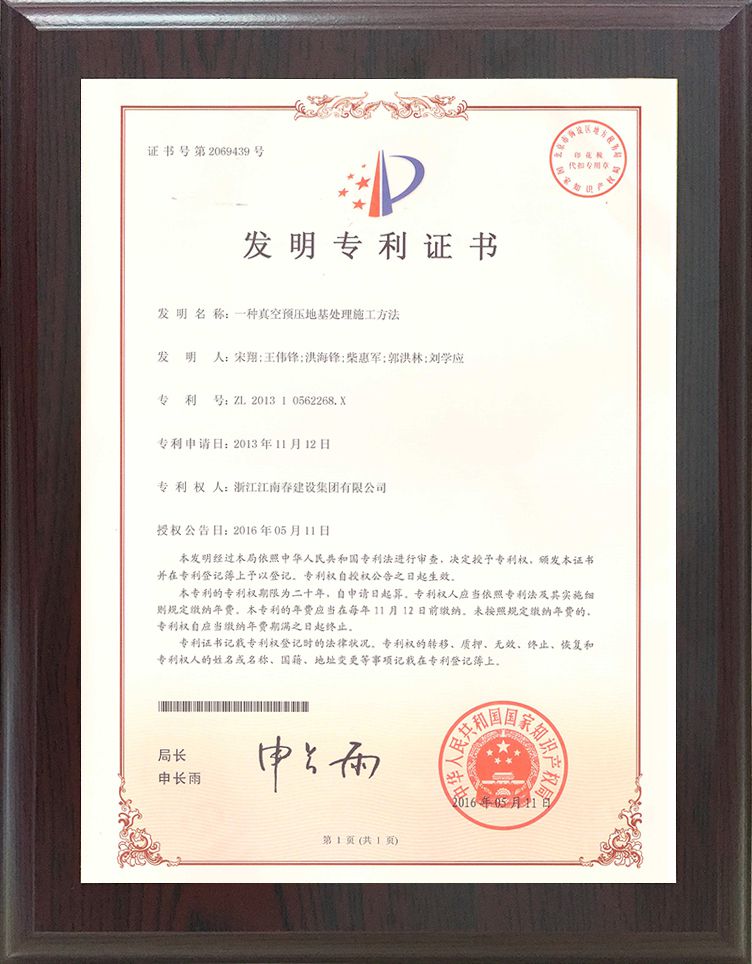 發(fā)明專利證書(一種真空預圧地基處理施工方法)