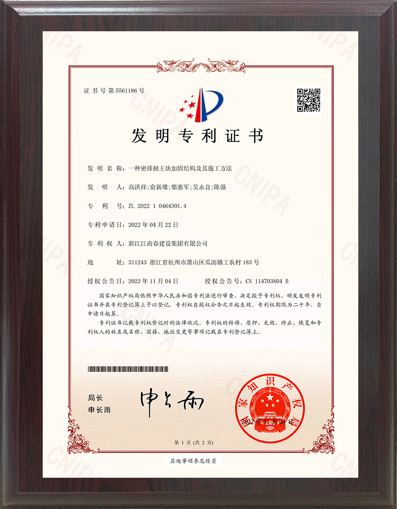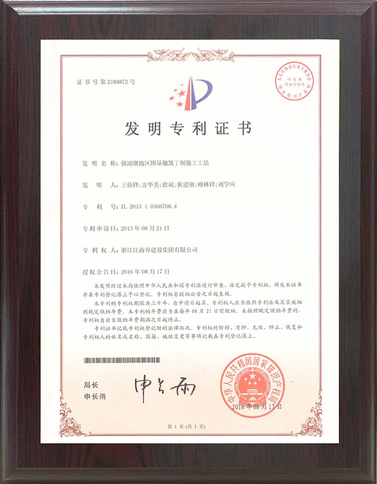 發(fā)明專利證書(強涌潮地區(qū)圍墾拋筑丁壩施工工法)