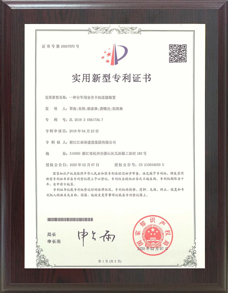 實用新型專利證書(一種臺車用安全卡扣連接裝置)