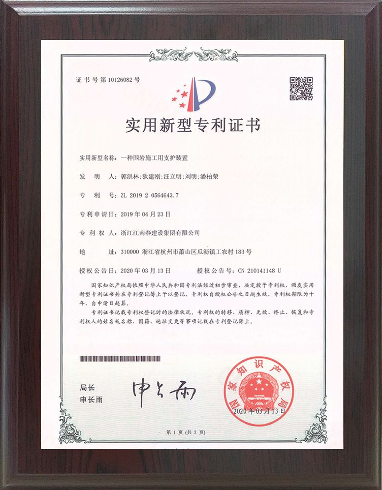 實用新型專利證書( 一種圍巖施工用支護裝置)