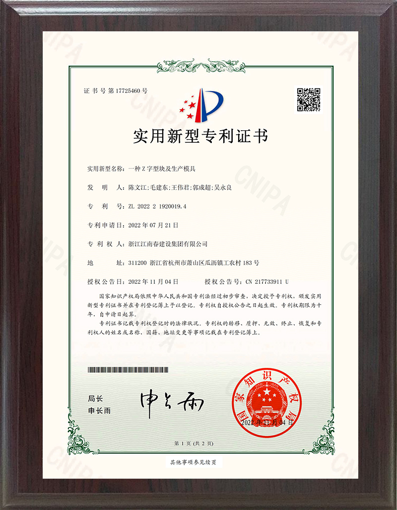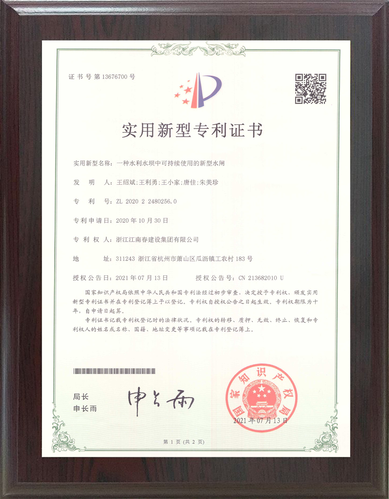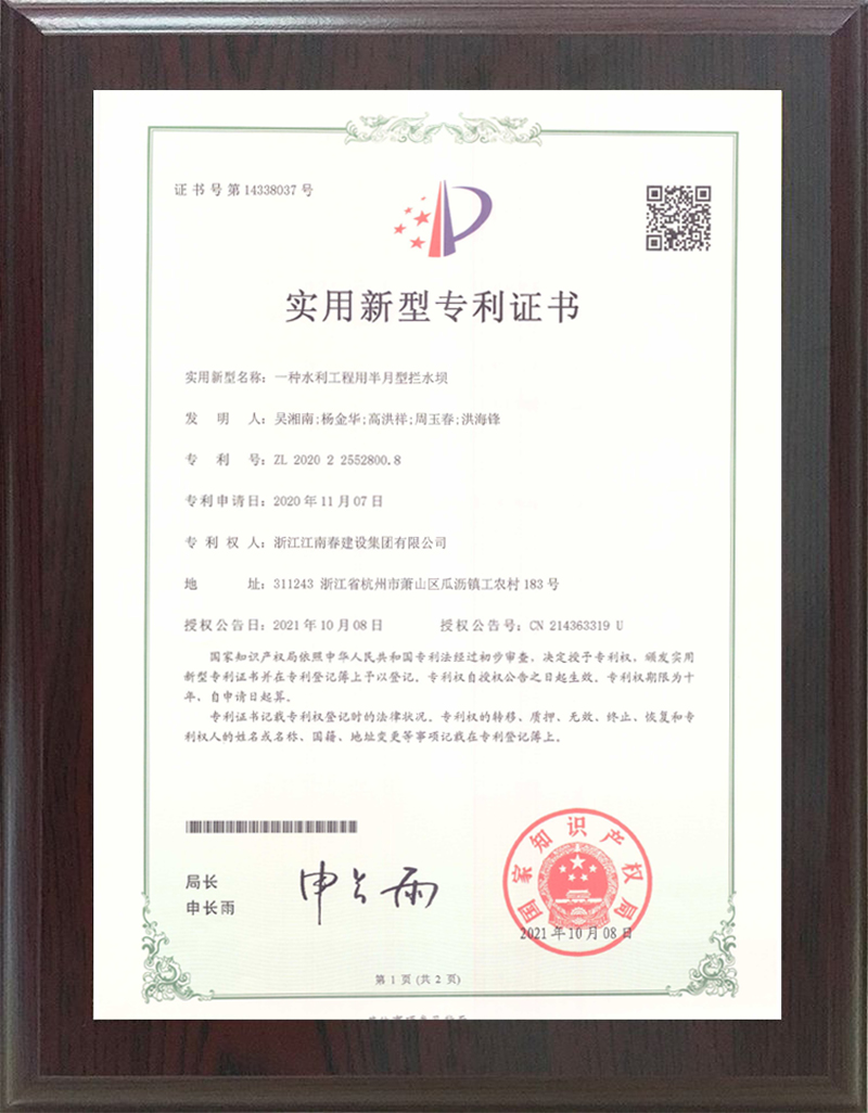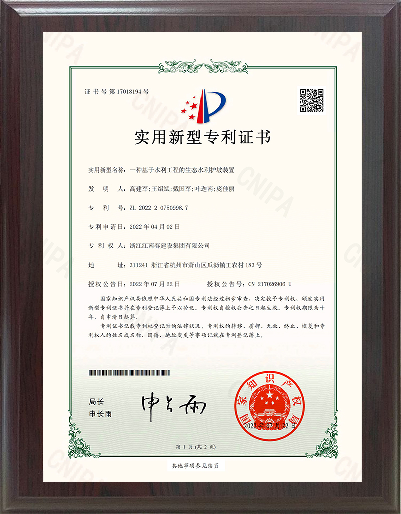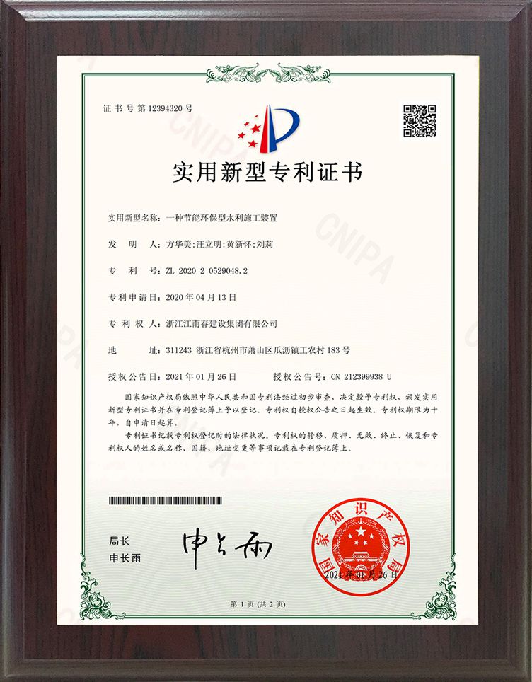 實用新型專利證書(一種節(jié)能環(huán)保型水利施工裝置)