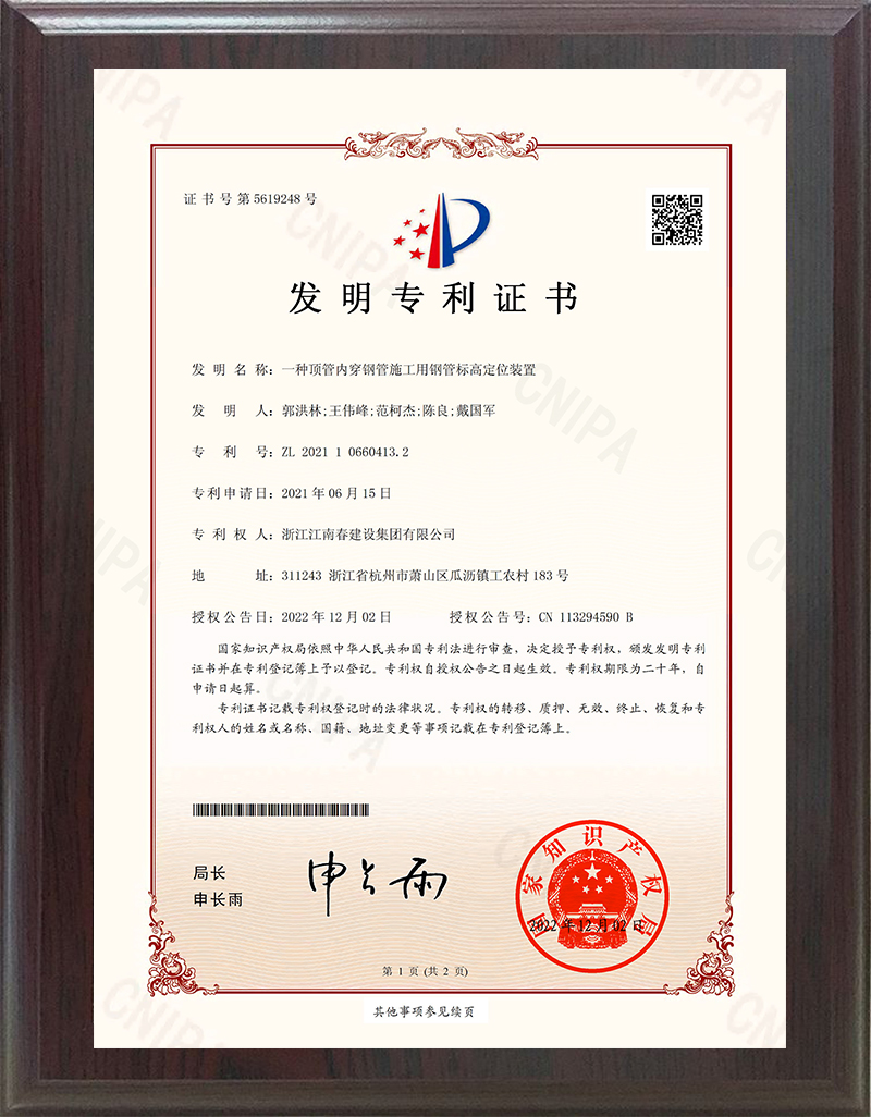 發(fā)明專利證書(一種鋼管柱混凝土頂升施工方法)