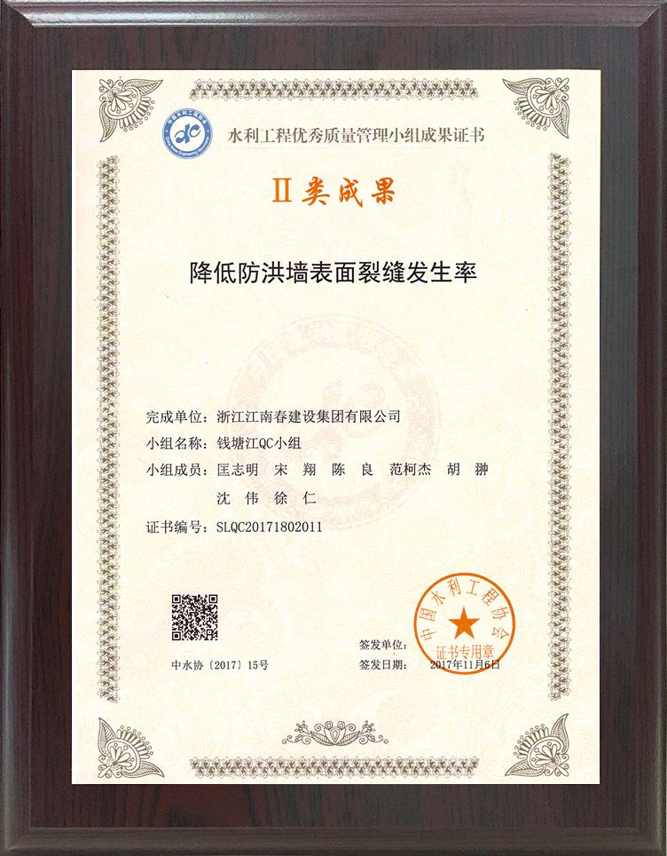 水利工程優(yōu)秀質(zhì)量小組成果證書II類成果(降低防洪墻表面裂縫發(fā)生率)