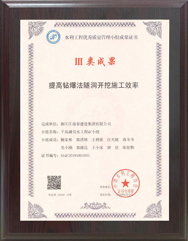 水利工程優(yōu)秀質(zhì)量管理小組成果證書III類成果(提高鉆爆法隧洞開挖施工效率)