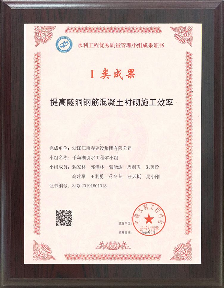 水利工程優(yōu)秀質(zhì)量管理小組成果證書 I類成果(提高隧洞鋼筋混凝土襯砌施工效率)