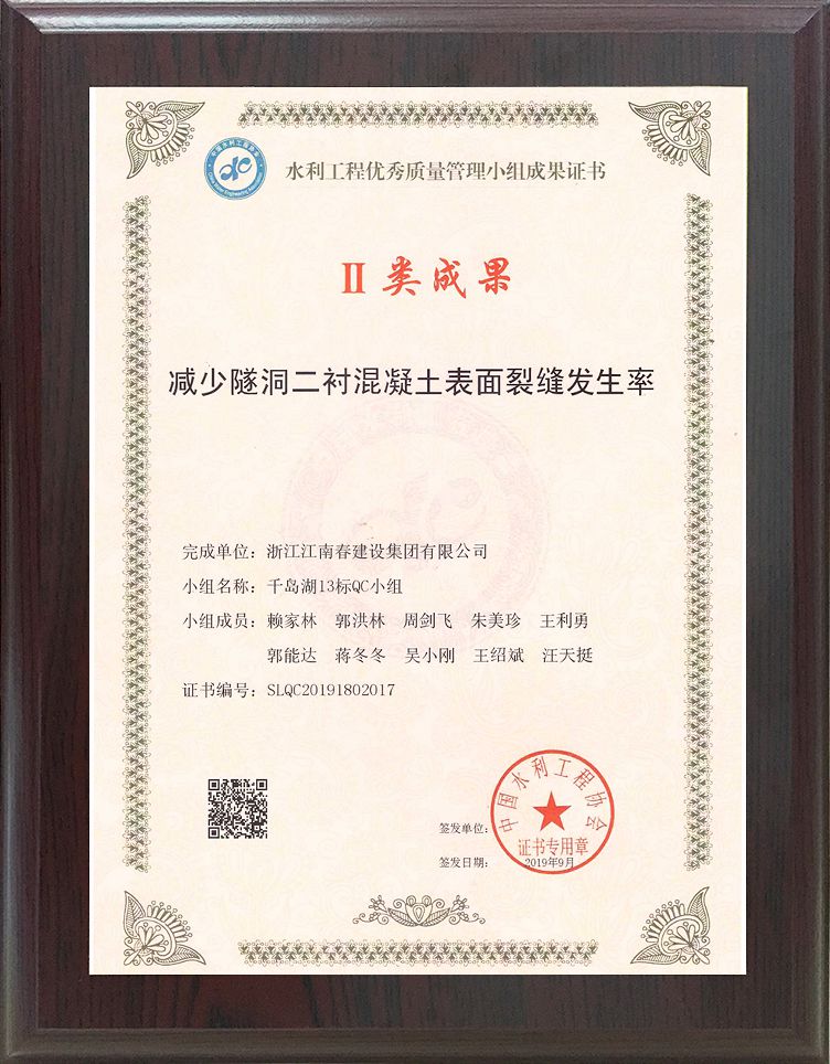水利工程優(yōu)秀質(zhì)量管理小組成果證書 II類成果(減少隧洞二襯混凝土表面裂縫發(fā)生率)