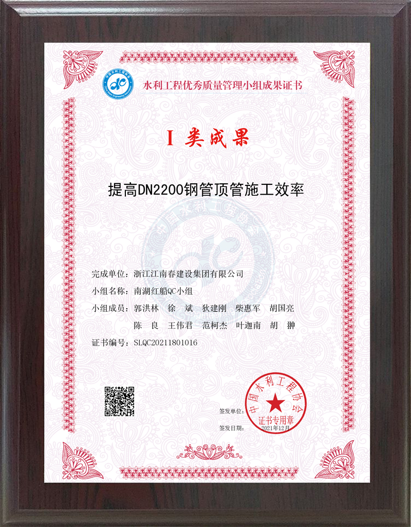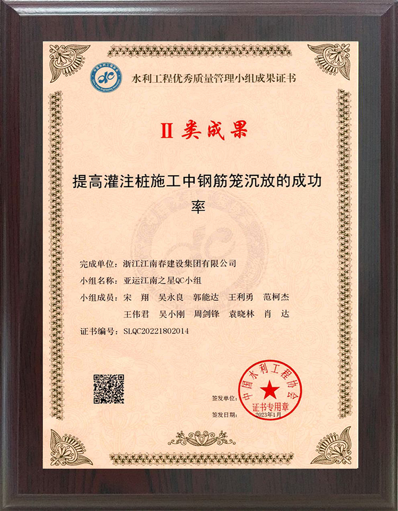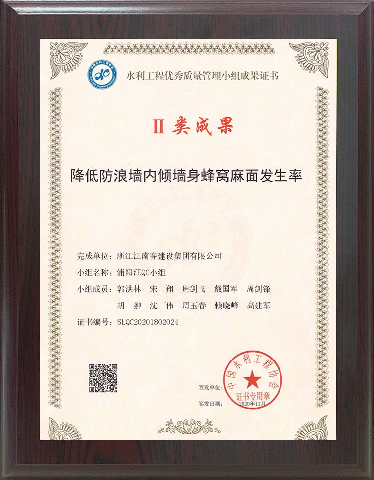 水利工程優(yōu)秀質(zhì)量管理小組成果證書 II類成果(降低防浪墻內(nèi)傾墻身蜂窩麻面發(fā)生率)