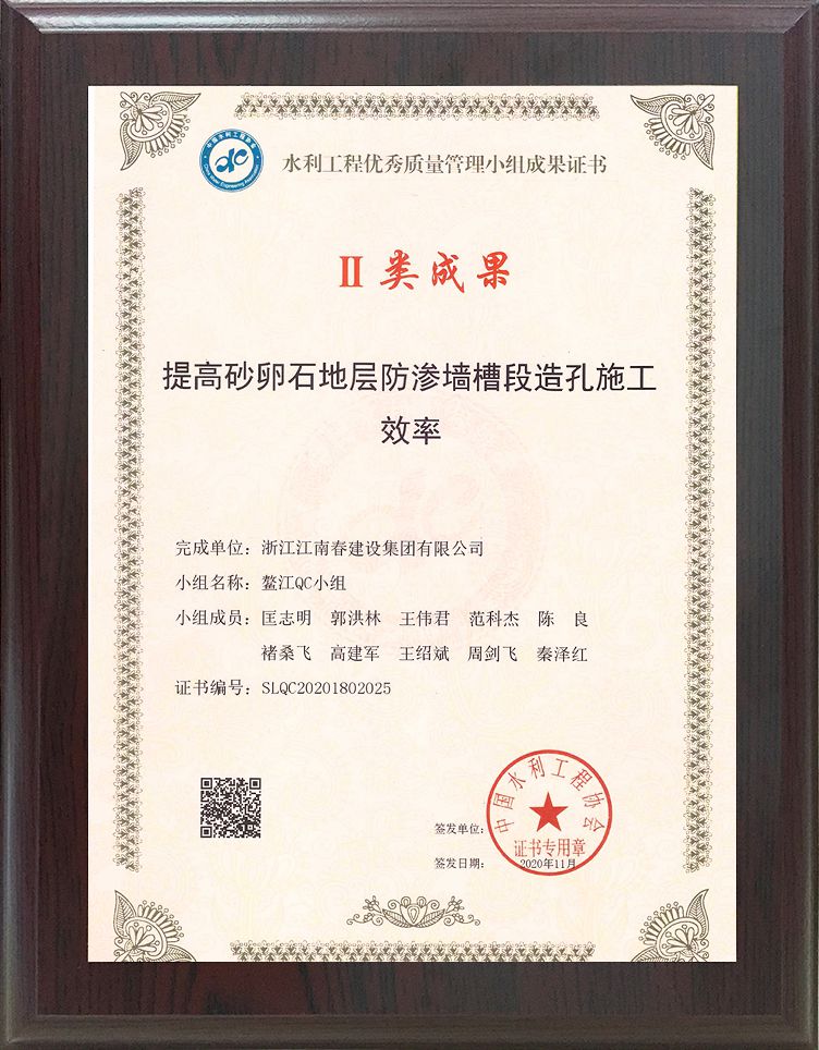 水利工程優(yōu)秀質(zhì)量管理小組成果證書 II類成果(提高砂卵石地層防滲墻槽段造孔施工效率)