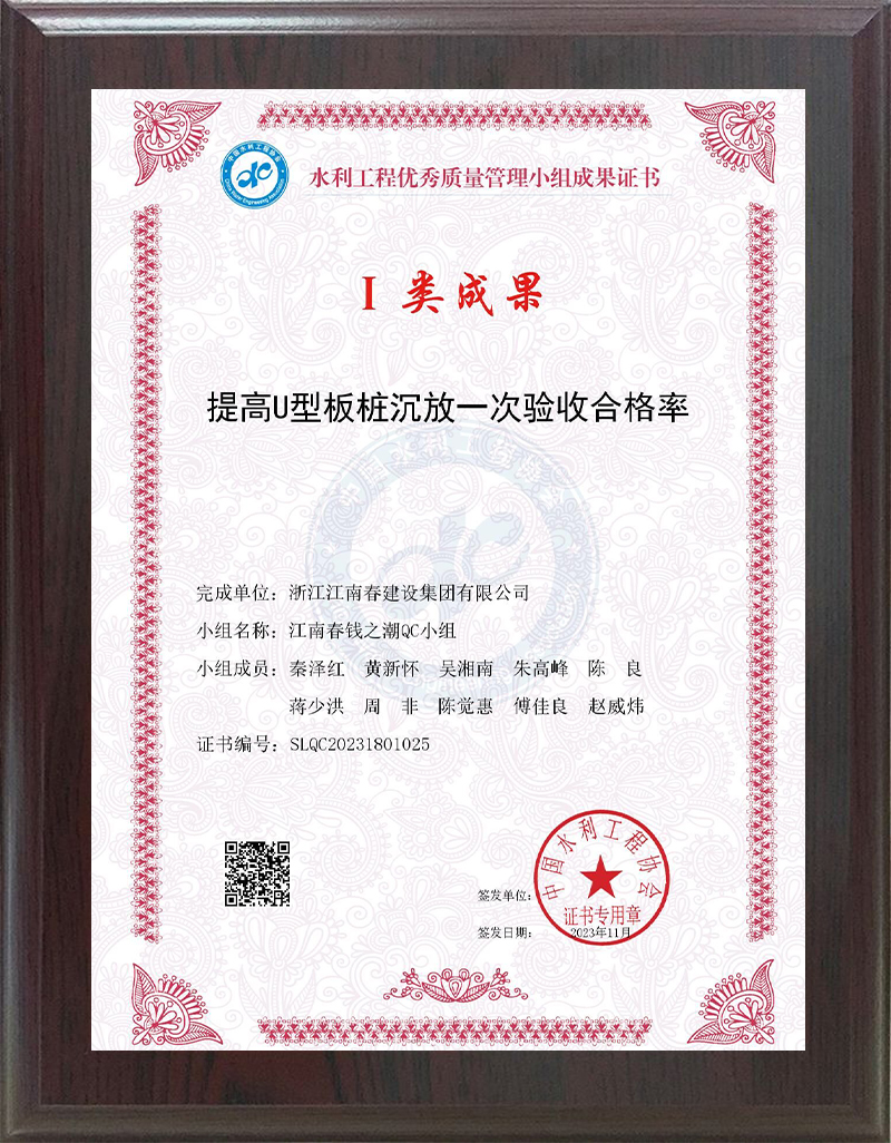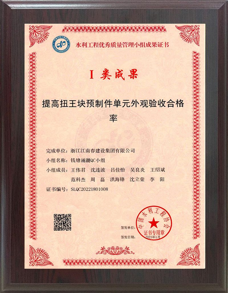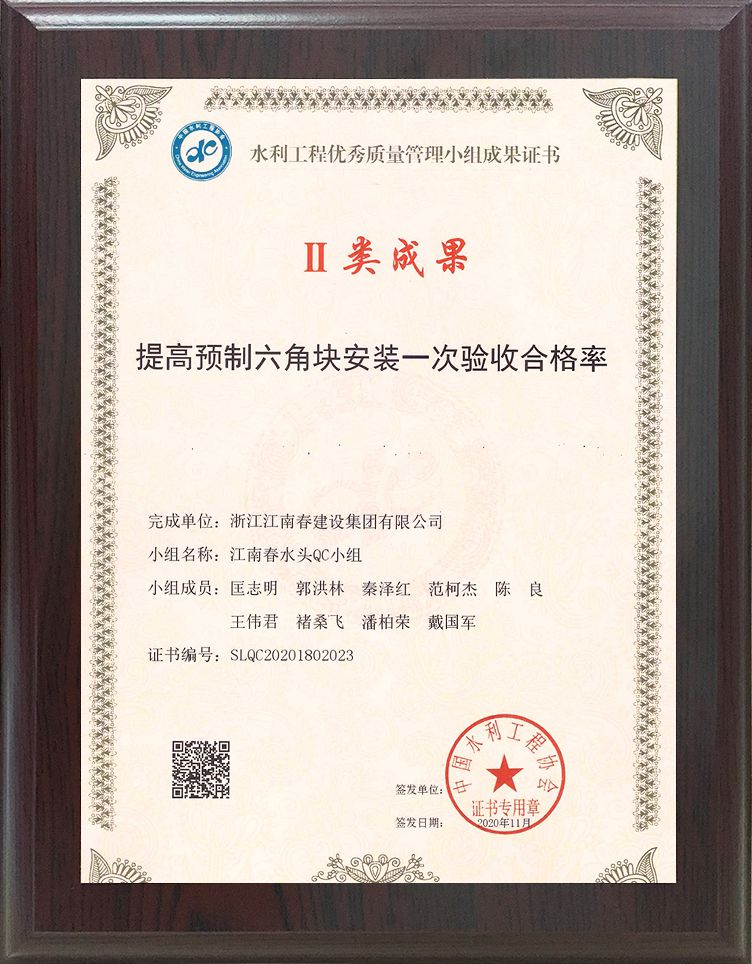 水利工程優(yōu)秀質(zhì)量管理小組成果證書 II類成果(提高預(yù)制六角塊安裝一次驗(yàn)收合格率)