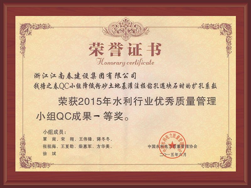 錢塘之春QC小組降低粉砂土地基灌注樁鉆孔遇塊石時(shí)的擴(kuò)孔系數(shù)獲2015年水利行業(yè)優(yōu)秀質(zhì)量管理小組QC成果一等獎(jiǎng)