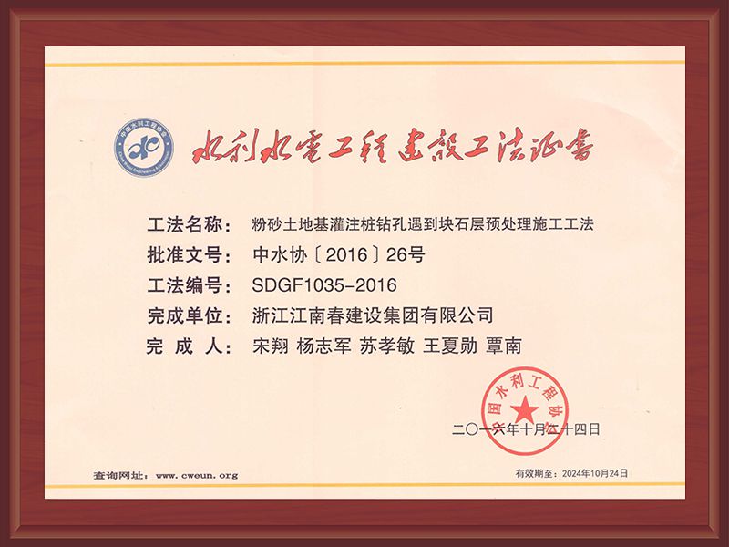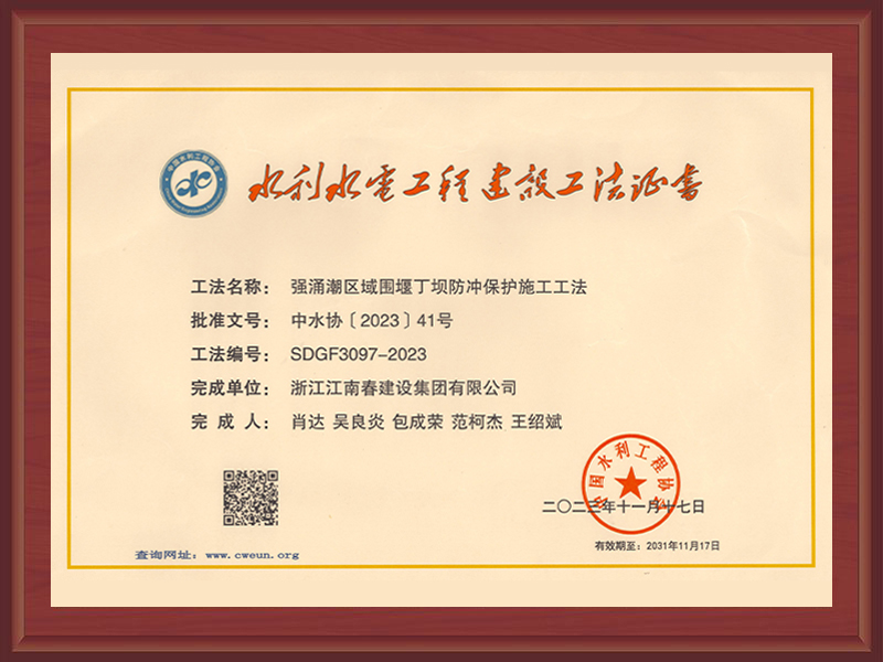國家級工法證書(強(qiáng)涌潮地區(qū)新型樁式丁壩施工工法)